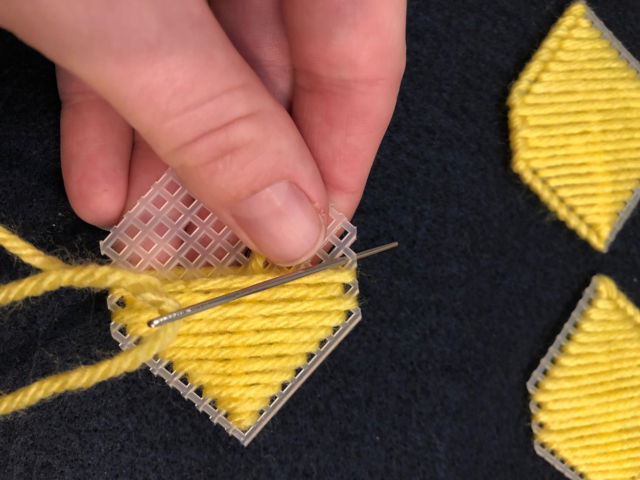 For this project we will use a tapestry needle that has a blunted edge. They aren't sharp so you can do this with children if you want. They have a nice wide opening so they will accept a piece of yarn through the eye. And it's small enough to pass through the holes of your embroidery plastic.